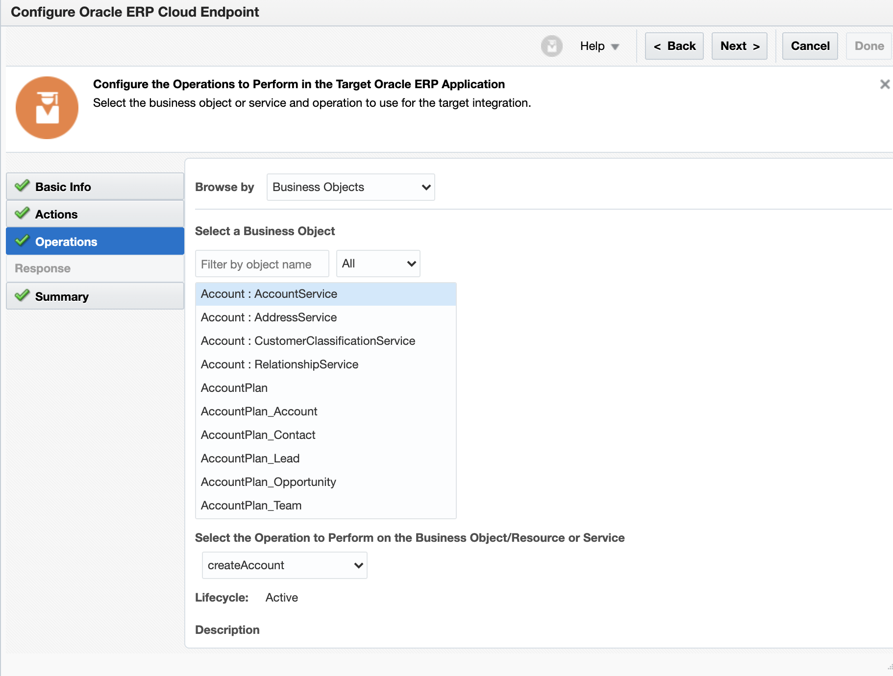 Here, this is the choosen action on the ERP adapter on the integration canvas.