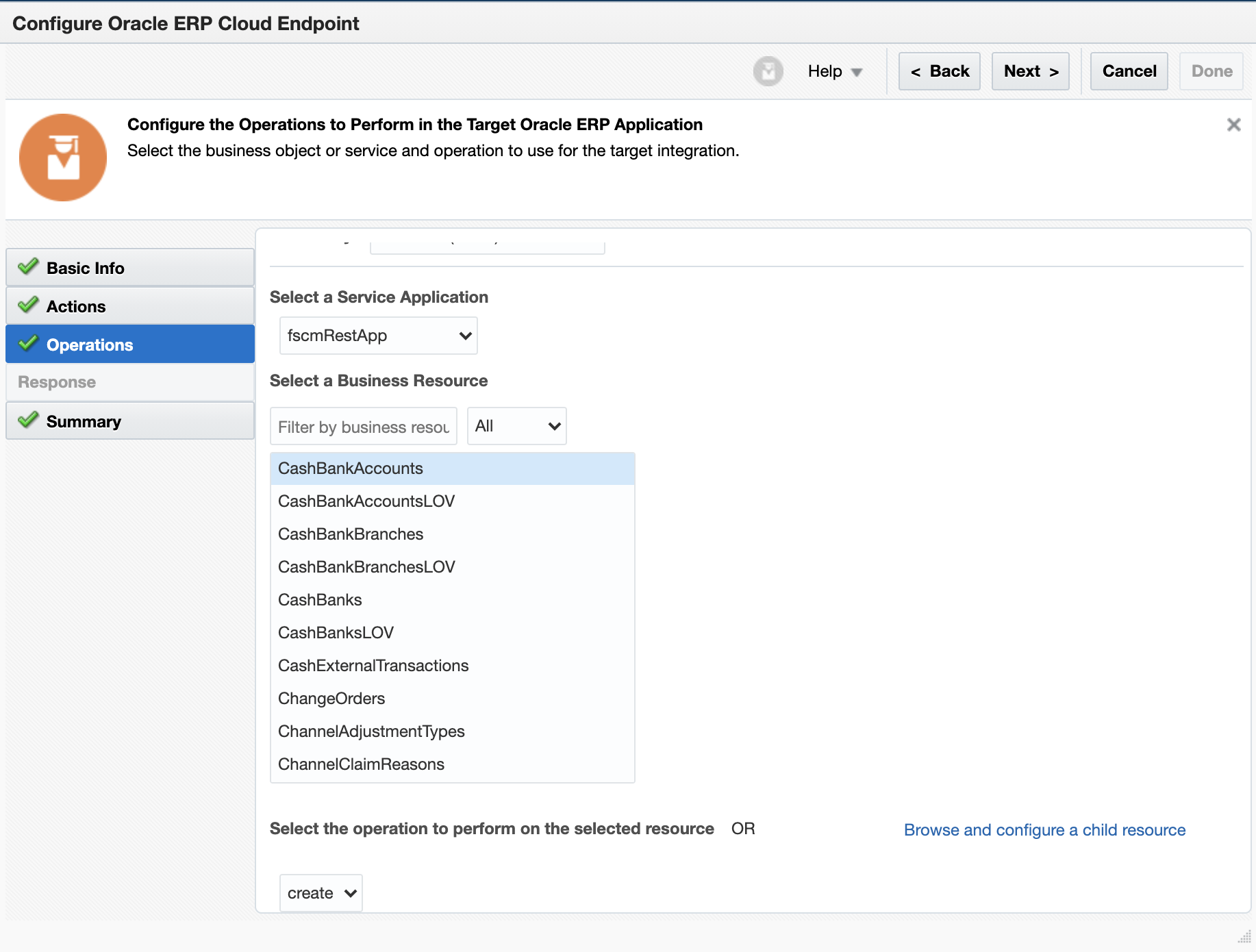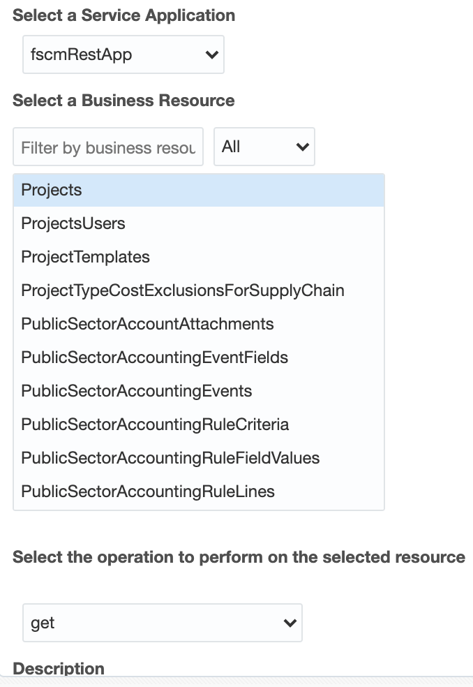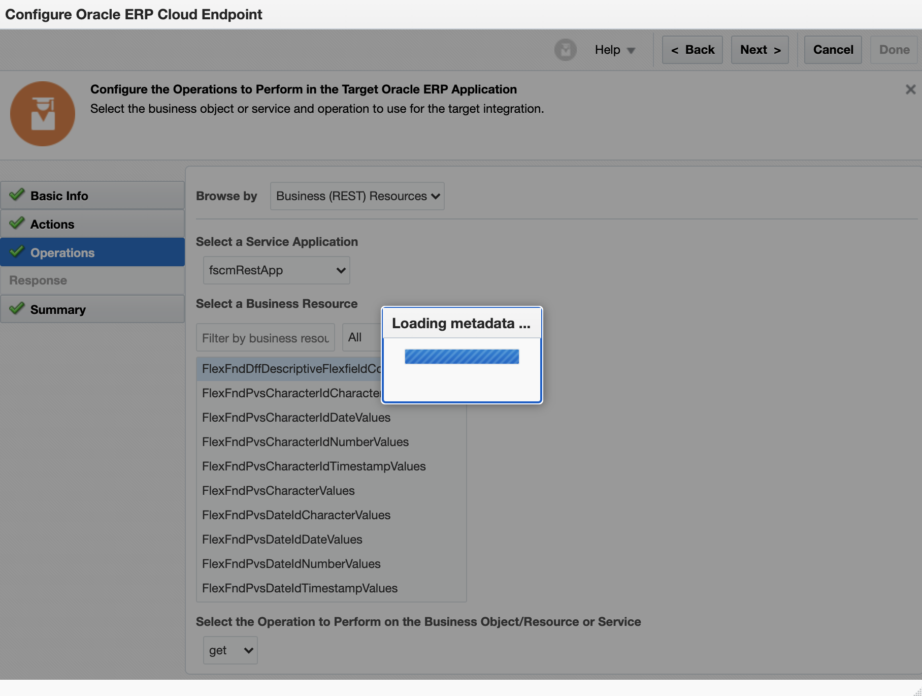 Select the ‘fscmRestApp’ to pull your ERP endpoints. If this is your first time, the ‘Loading metadata’ pop-up may take a couple minutes to finish. If you get a 500 error instead of seeing the REST resources, you need to apply the roles & privileges linked at the beginning of section 2.