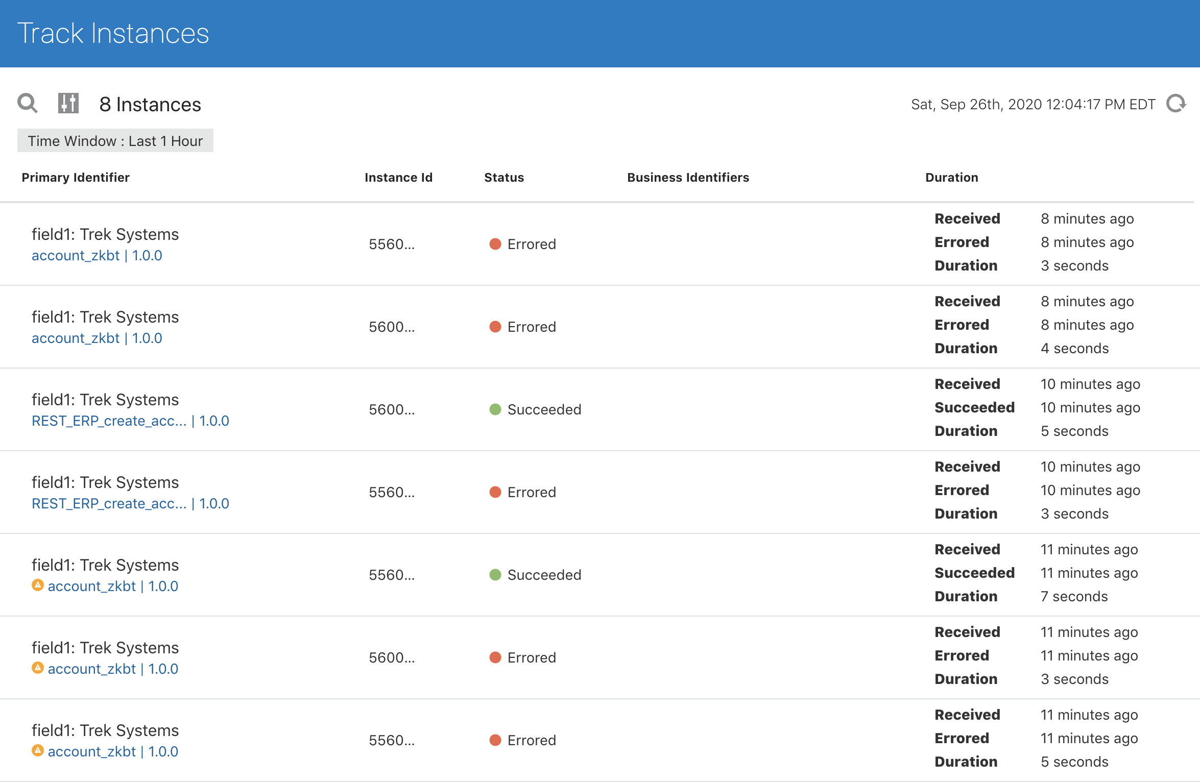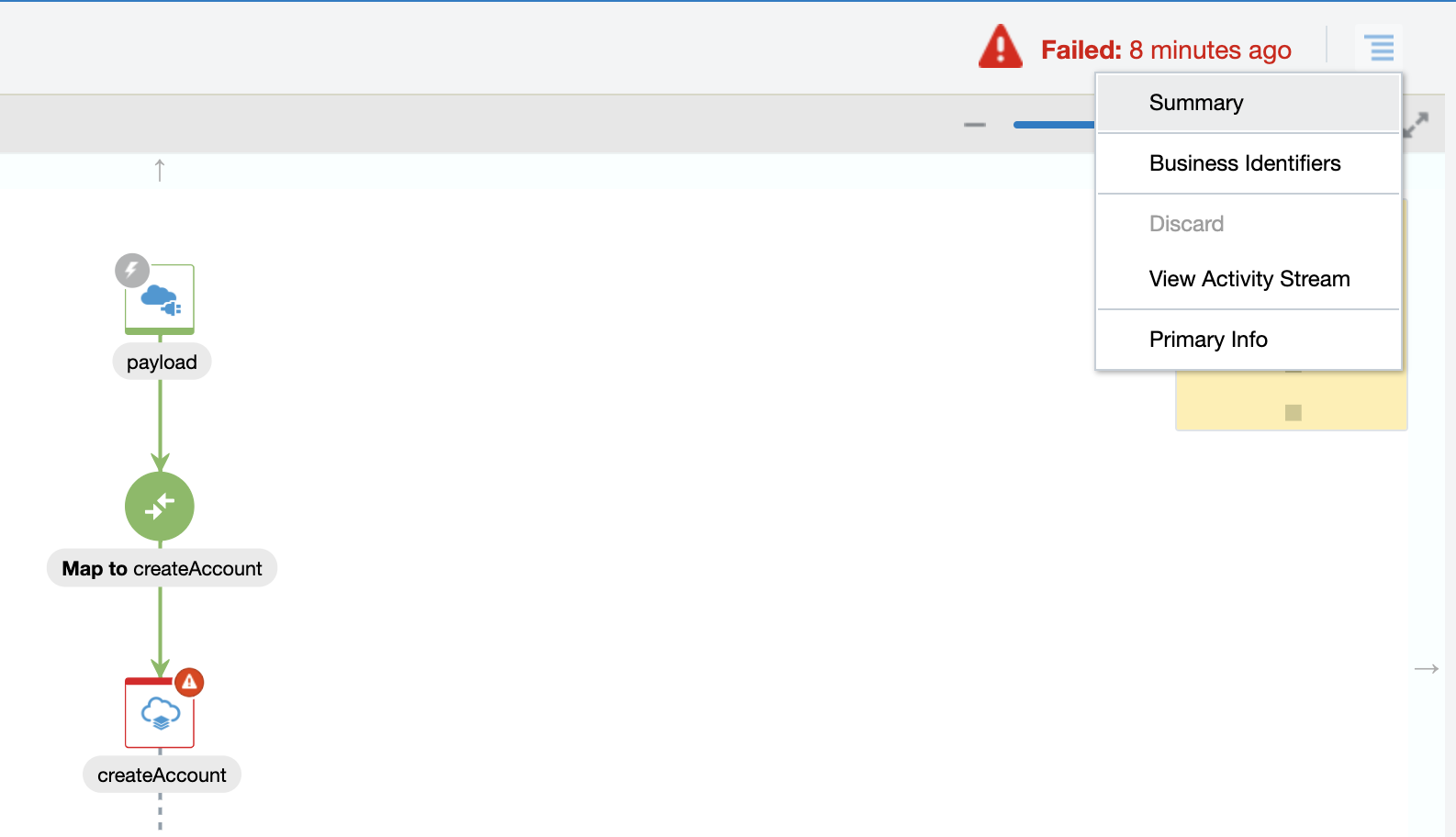 The screenshots below show you how to find these errors and troubleshoot within OIC. From the OIC Service Console home page, go to monitoring -> tracking or monitoring -> integrations. On tracking, click the black text with your tracking field to view that specific run. You can view errors on the activity stream, or by clicking the red connection and then the ‘!’.