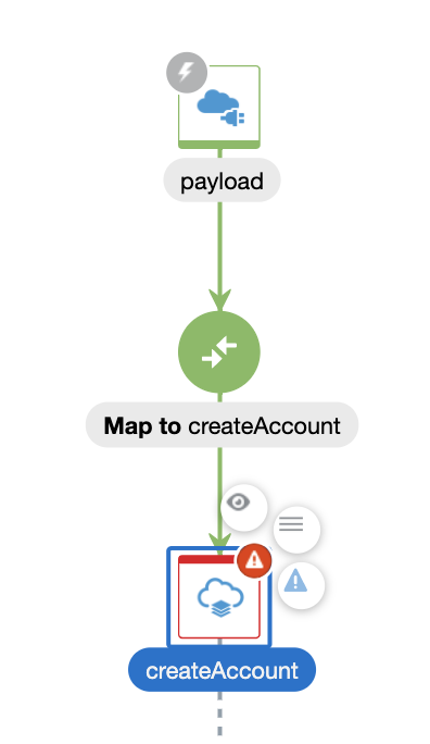 The selected operation on our ERP adapter is set to create an account. This is a sample payload that can be received by the starting REST adapter.