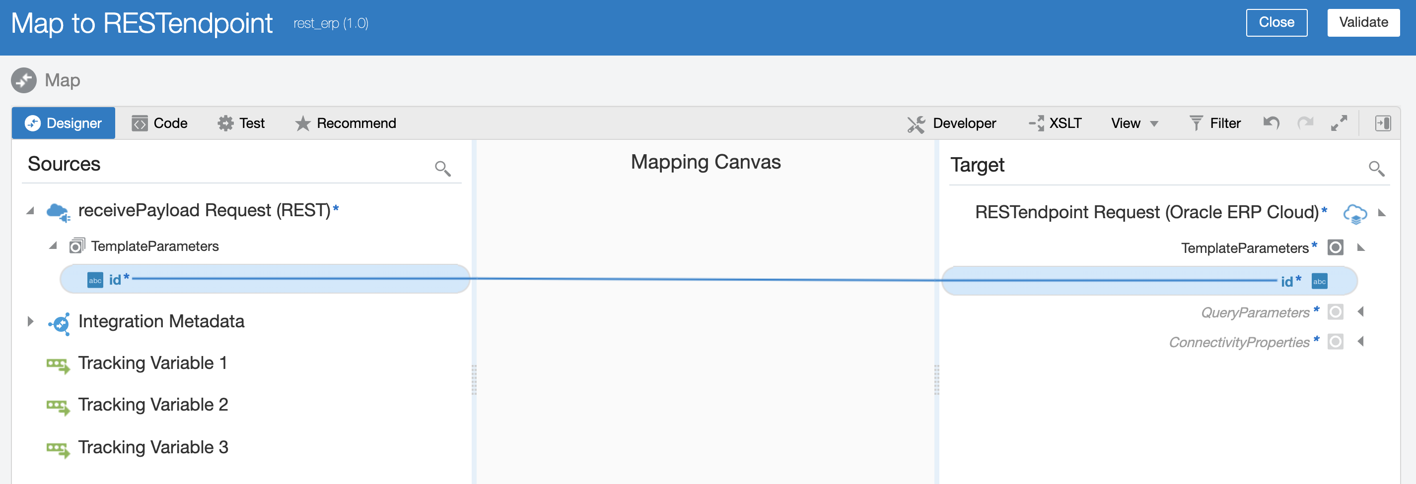 Below, you can see that we map the id parameter from the REST adapter to the id parameter input on the ERP connection.