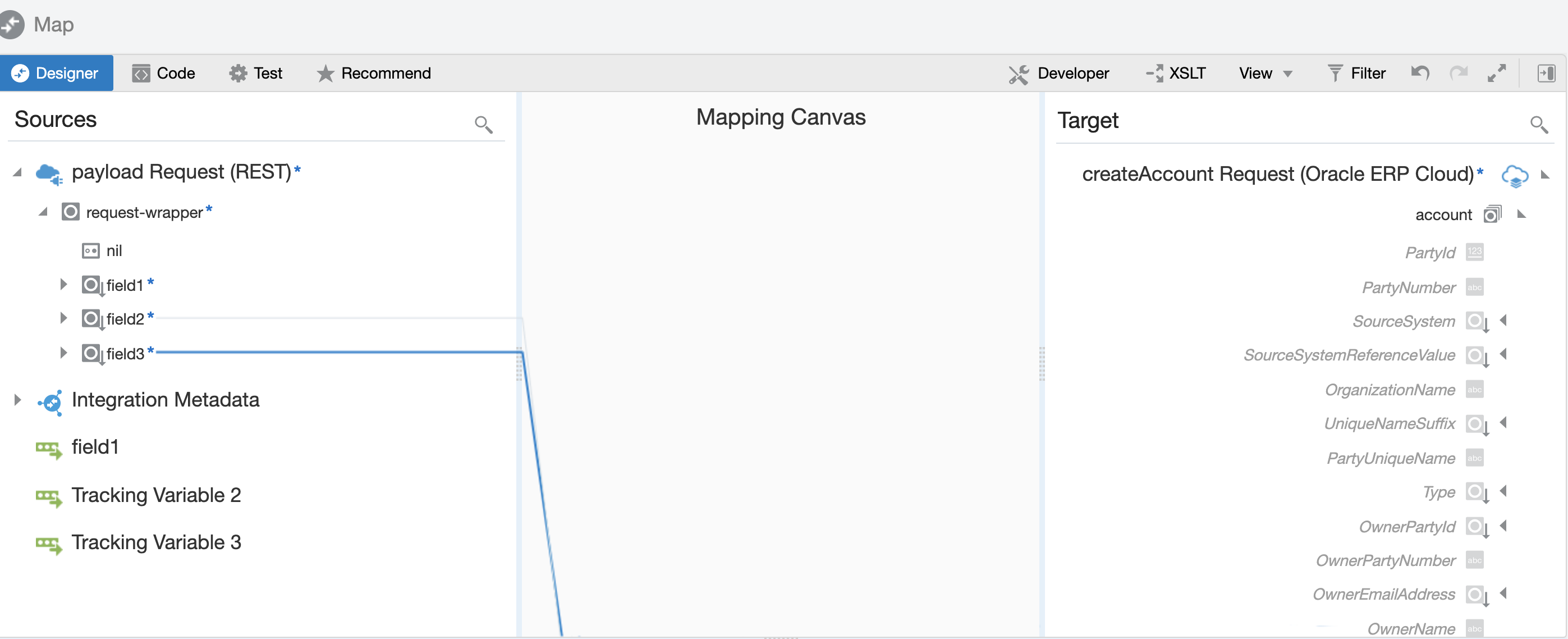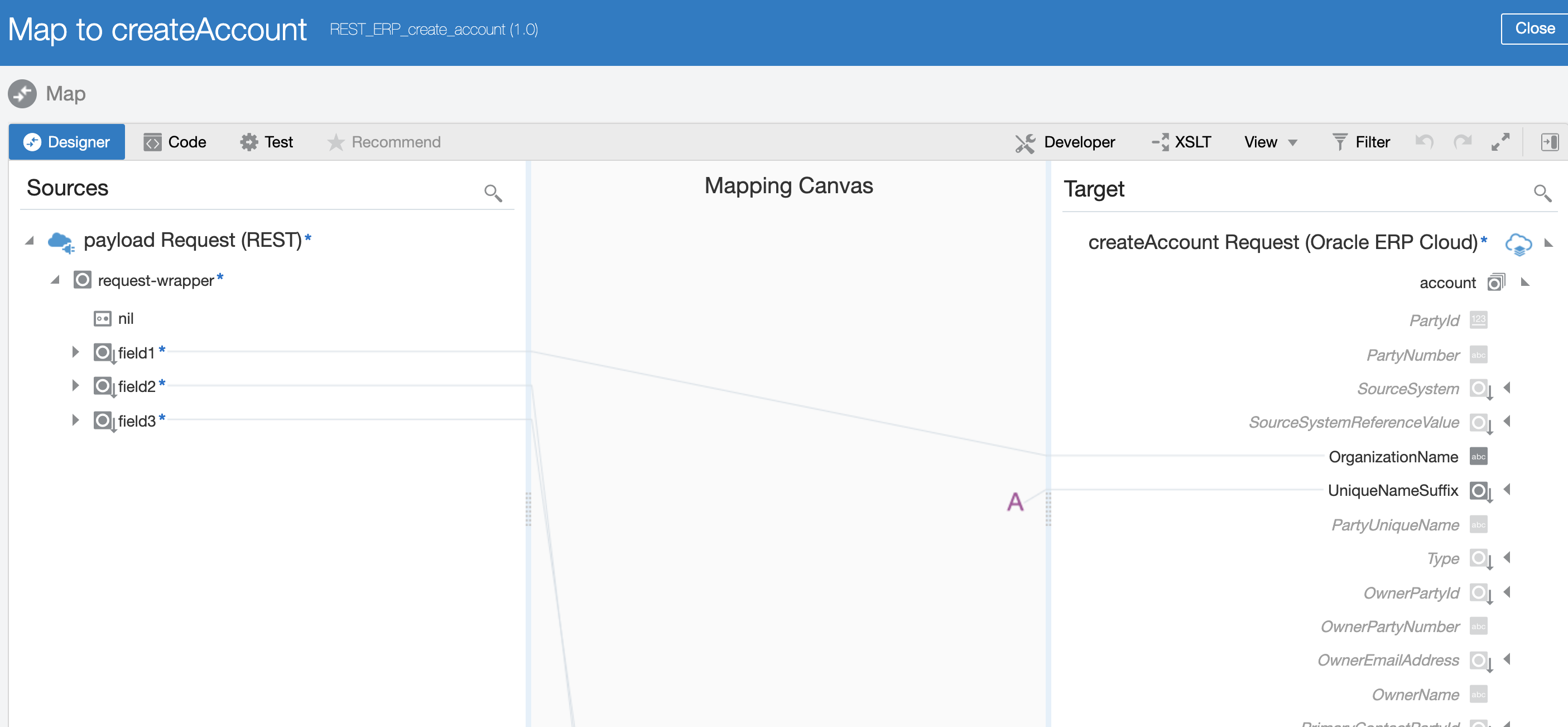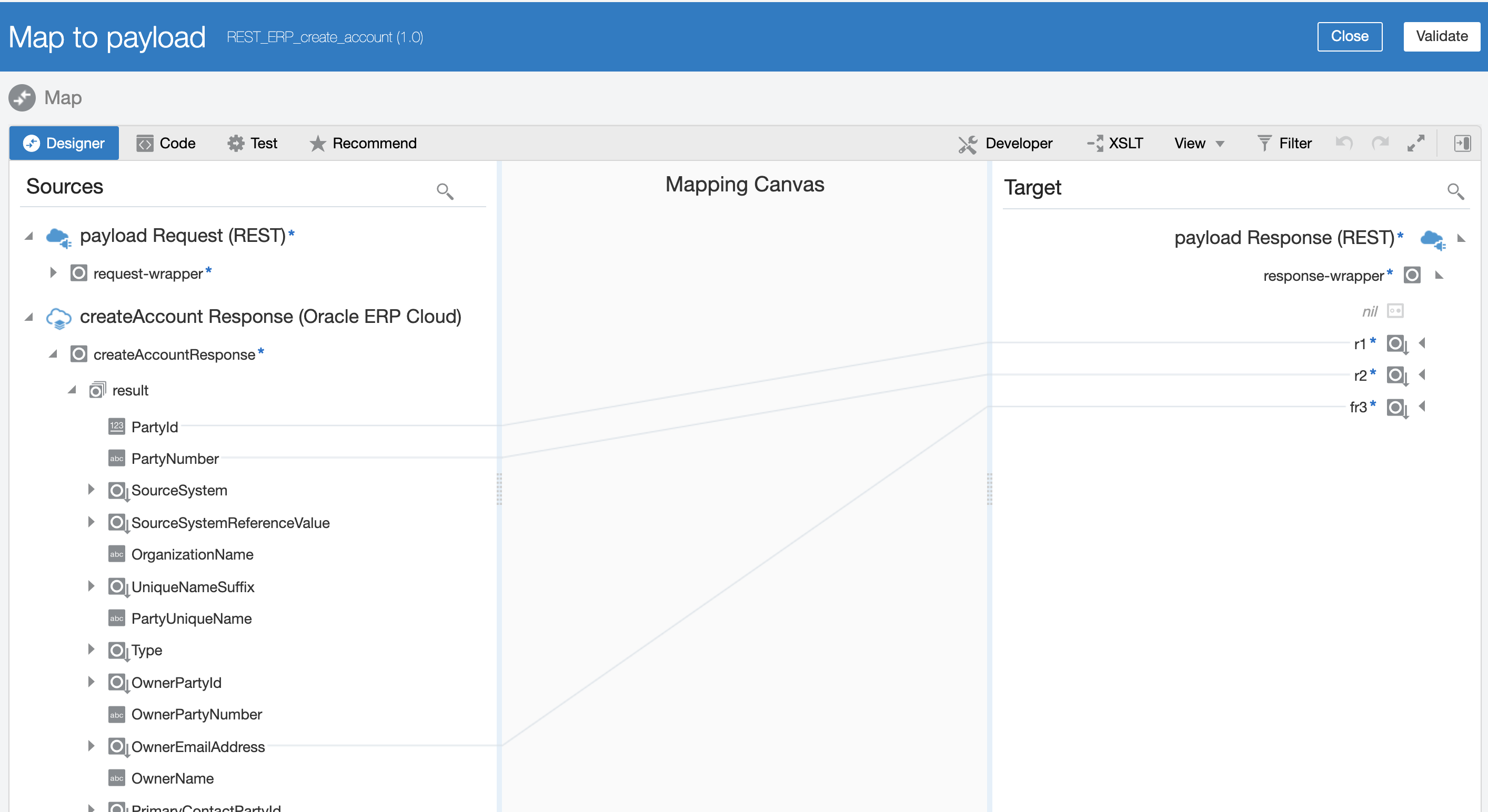 Here we map the response from ERP back to the REST endpoint. We get the PartyId, PartyNumber, and user that created the account as the response.