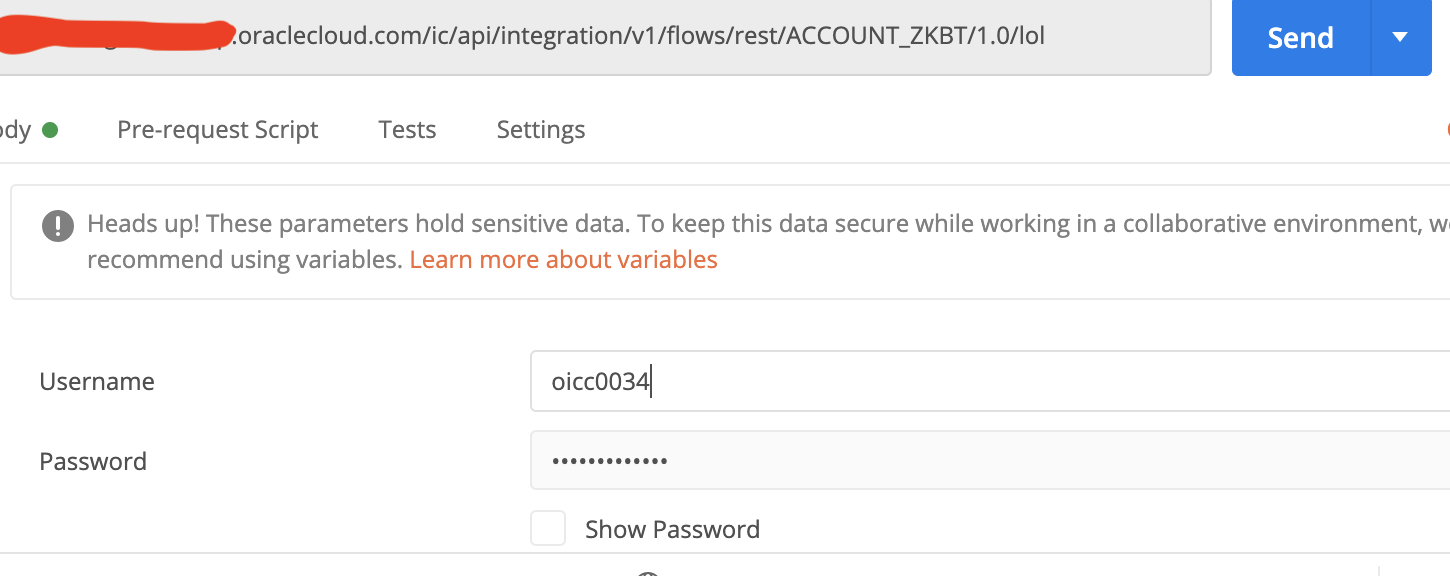 For this workshop, you can download Postman or test your integrations inside of OIC. For hitting your integration endpoints from Postman, use basic auth and ensure your user has the necessary IDCS role for OIC, like how oicc0034 does.